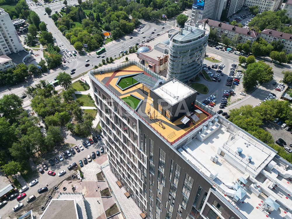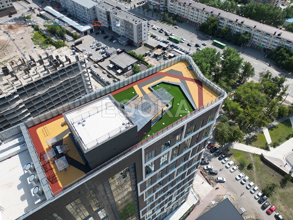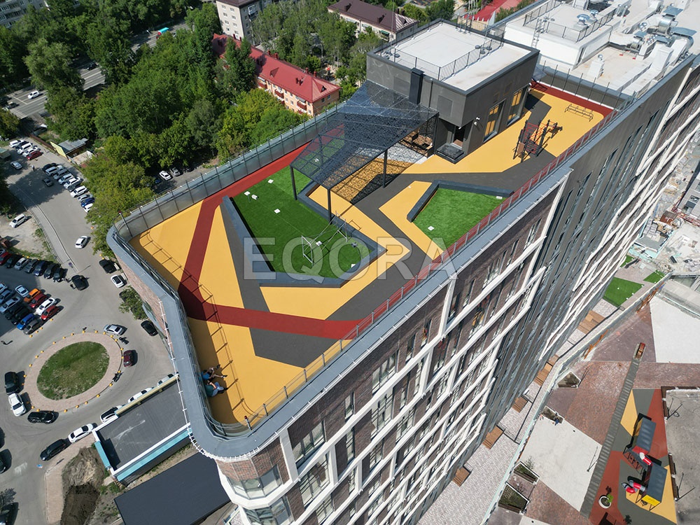 Материал: эластичное травмобезопасное покрытие из резиновой крошки EQORA SBR с амортизирующей подложкой толщина от 20 до 100 мм Объект: ЖК «Машаров» г. Тюмень Площадь: 500 м2